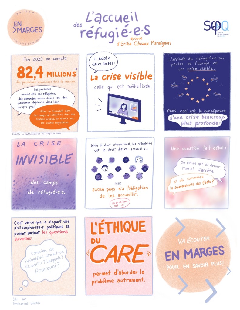 Bande dessinée (crédits : Emmanuel Boutin) accompagnant mon passage au balado En marges du Comité Équité de la Société de philosophie du Québec.